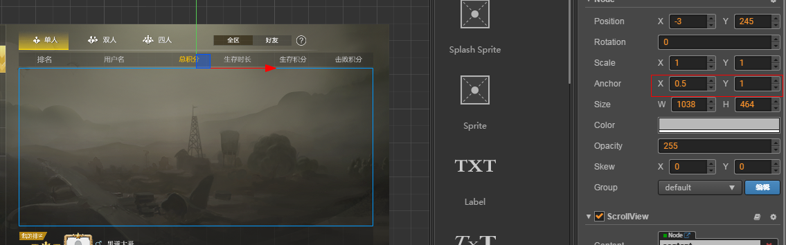 滑动列表的布局结构如下图,为了对齐和方便布局的是scrollview,view和content的锚点都是(0.5,1)